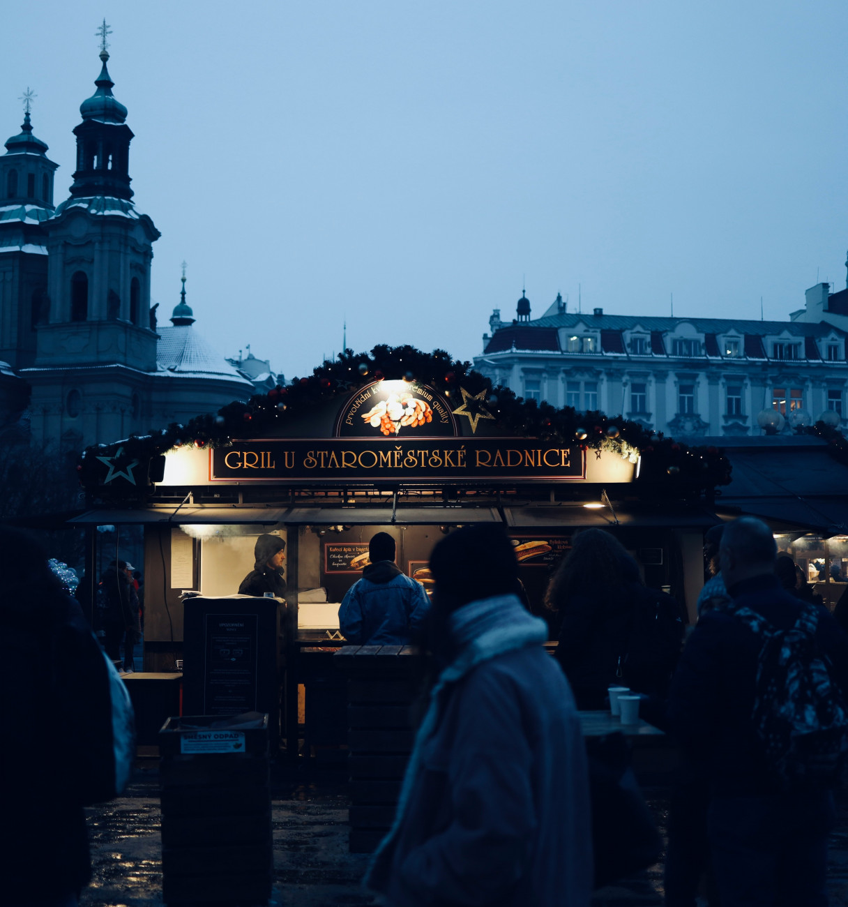 Η Πράγα, που μοιάζει με καρτ ποστάλ, αποτελεί ιδανική επιλογή για τις γιορτινές στιγμές. Οι ντόπιοι προτιμούν να πίνουν grog – ρούμι με νερό, λεμόνι και ζάχαρη, αντί για ζεστό κρασί. Το σκηνικό είναι μαγευτικό: από τη μία η εκκλησία του 14ου αιώνα και απέναντι το διάσημο αστρονομικό ρολόι του 15ου αιώνα.