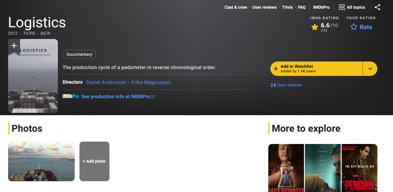 Ίσως να σας φαίνεται βαρετό, ωστόσο από τις 116 κριτικές που έχει η ταινία των 857 ωρών στο IMDB, το 46,6%, δηλαδή 54 θεατές, την έχουν βαθμολογήσει με 10.