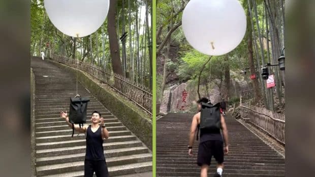 Ο fitness influencer, Pu, χρησιμοποίησε ένα μεγάλο μπαλόνι φουσκωμένο με ήλιο, δεμένο στο σακίδιο του, για να μειώσει το βάρος κατά τη διάρκεια της πεζοπορίας. Στο βίντεο που δημοσίευσε στην πλατφόρμα Douyin, φαίνεται πως το μπαλόνι ανυψώνει την τσάντα του, κάνοντάς τον να νιώθει πιο ελαφρύς.