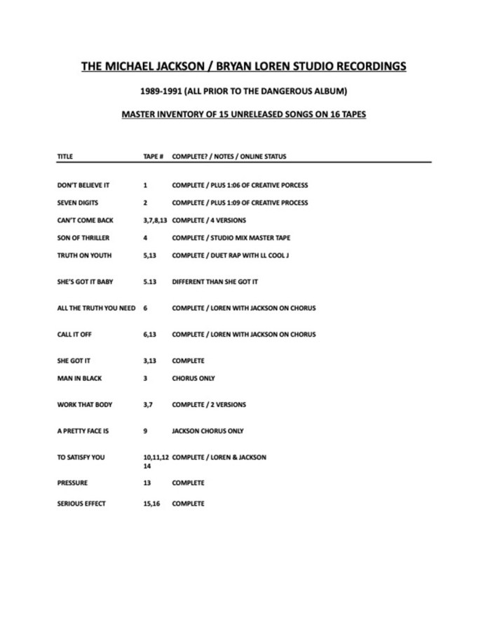 Ανάμεσα στα ακυκλοφόρητα κομμάτια συμπεριλαμβάνεται ένα με τίτλο «Don’t Believe It», που φαίνεται να αναφέρεται στις φήμες που κυκλοφορούσαν στα ΜΜΕ για τον Jackson.