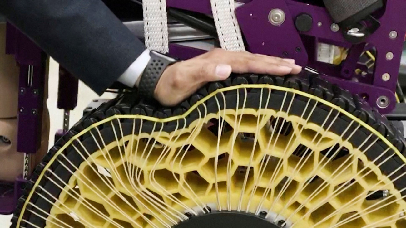 Ο έξυπνος τροχός αποτελείται από έναν εξωτερικό δακτύλιο με μεταλλικές πλάκες που λειτουργούν σαν ερπύστρια, και στηρίζεται σε έναν ελαστικό σκελετό από κυψελωτό πλαστικό. Η ευκαμψία του ρυθμίζεται μέσω μεταλλικών ακτίνων, που παρακολουθούνται από αισθητήρες και προσαρμόζονται στο ανάγλυφο του εδάφους. Η τεχνολογία αυτή επιτρέπει στον τροχό να κυλά πάνω από εμπόδια ύψους έως και 1,3 φορές το ύψος της ακτίνας του, κάτι που δεν ήταν δυνατό με τις παραδοσιακές ελαστικές ρόδες χωρίς αέρα.